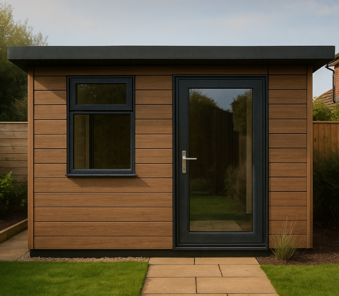 The ultimate maintenance free Garden Office! If you are looking for a Garden Office that is strong, solid and eco-friendly, then this is for you. Fitted with UPVC Double Glazed doors & windows, insulated walls & roof and laminate floor as standard, this model is ready to work in from the moment it's installed, which is also included at no extra cost. Our Garden Offices come complete with at least one opening window to help with air-flow on warmer days and include 5 lever locking systems which meet insurance industry standards and keep your office equipment safe and secure. With a choice of Colours on both the Cladding and Door & Windows, you can customise the style to suit your setting! This top of the range model offers up to a 25 year guarantee! Want to customise your Garden Office? Call us or pop in for bespoke designs.