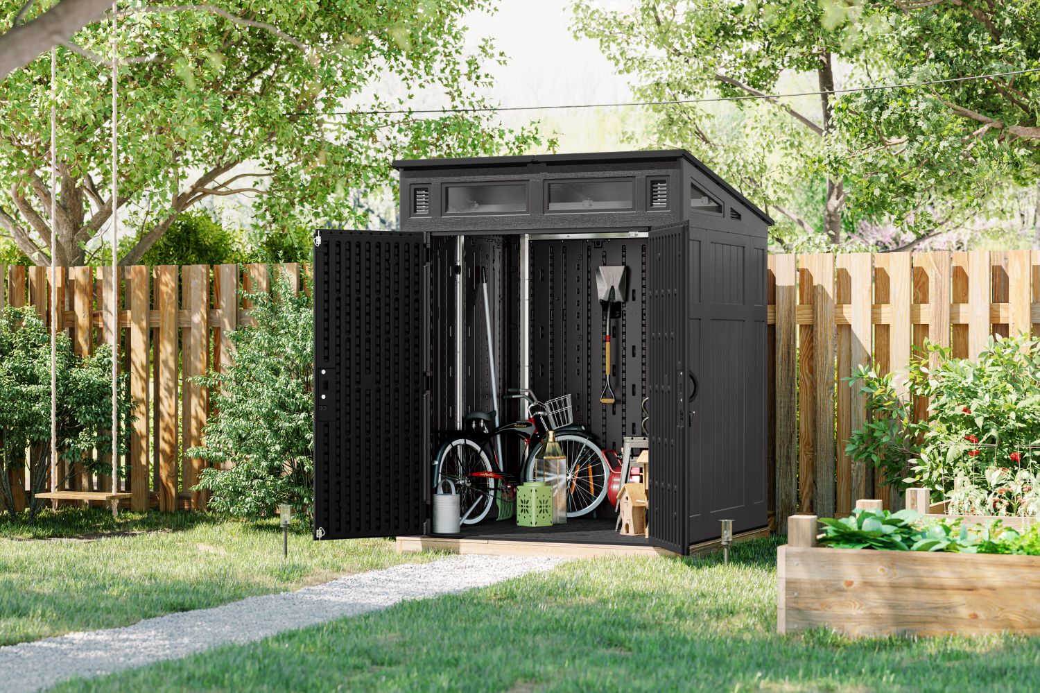 A combination of strength and storage, the 6 ft. x 5 ft. Modernist® Storage Shed by Suncast® Features 6m3 of storage space and is ideal for storing all your outdoor equipment. A steel frame structure and multi-wall resin panels provide maximum strength and durability. Sturdy double doors allow you to access your items easily, and the doors are pad-lock ready for added security (lock not included). Large transom windows allow for natural light making it easy to find what you need. This shed is beautiful, strong and built to withstand the elements all year round.